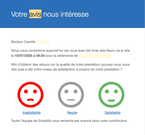 Des pictos “tristesse / neutre / satisfait” et une question simple : “Quel a été votre niveau de satisfaction à propos de notre prestation ?” C’est mesuré, humain, respectueux.