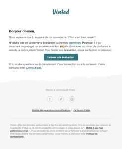 Ce n’est pas juste un sondage : c’est un geste pour la communauté. Vinted mentionne le vendeur par son nom, et invite à consolider un climat de confiance. Le clic n’est plus un service, c’est un petit engagement collectif.