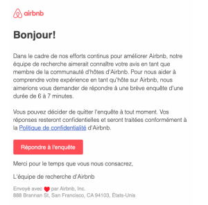 Ici, l’objet est limpide et l’intro est directe : “6 à 7 minutes”. En annonçant la durée, on évite les abandons. Ensuite, l’e-mail fait le job : pourquoi répondre, comment seront traités les retours (vie privée), et un bouton rouge bien visible.