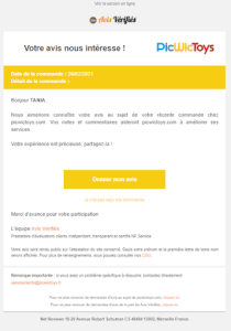Un email automatisé post-achat, sans chichi. Pas de visuel produit ici, mais un rappel de la commande et une grille d’étoiles pour aller droit au but. Le lien vers l’avis est clair, et le système est rôdé.