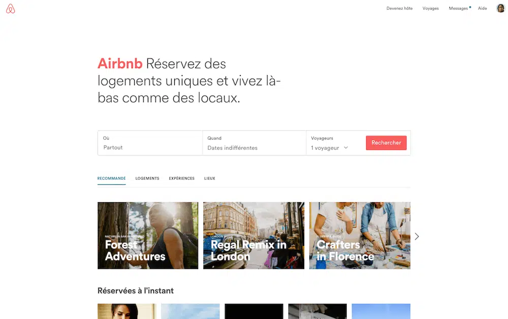 Barre de recherche au centre, logements en scroll horizontal, filtres efficaces. C’est la plateforme qui s’exprime, sans habillage inutile. Et ça suffit à séduire.