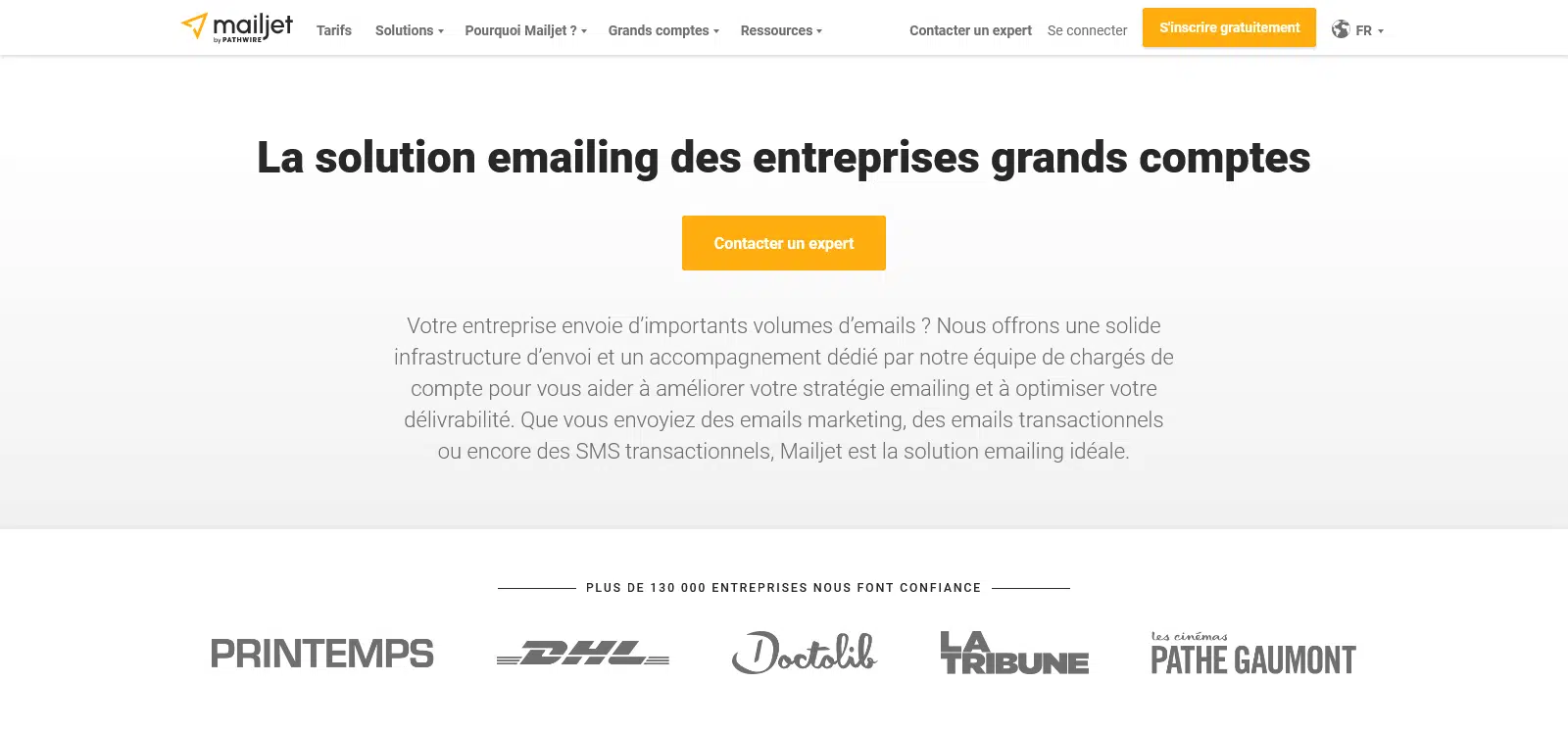 La page d’accueil doit inclure des boutons d’appel à l’action (CTA), du type : « Essayez maintenant », « Essai gratuit », « Réserver une démo », « Acheter maintenant », « En savoir plus », etc. Par exemple, Mailjet a choisi de mettre en avant un simple « contactez-nous » qui ressort en jaune sur un fond très pâle, ceci fait ressortir le CTA :