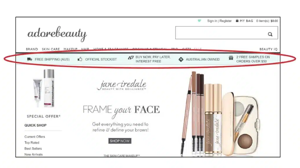 « Pourquoi acheter ici et pas sur Amazon ? » est une question à laquelle tous les sites de commerce électronique doivent répondre. Une barre d’avantages juste en dessous du « header » est une bonne manière de répondre à la question.