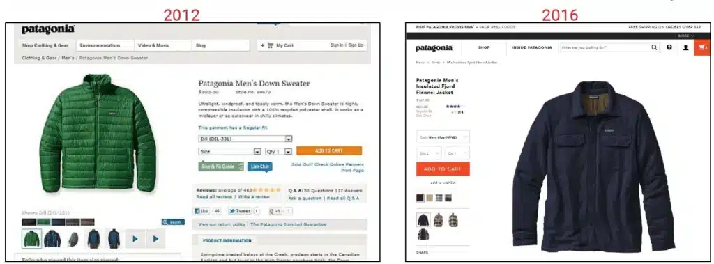 L’expérience de l’utilisateur doit être lisse. Lisse dans le sens où ils ne devraient jamais avoir à chercher quelque chose. Les choses et la navigation doivent fonctionner naturellement. Si les gens ont besoin de chercher des boutons « ajouter au panier » ou « checkout », vous échouerez. Ces deux-là, sont les boutons les plus importants dans votre magasin. Vous les voulez grands, audacieux et proéminents. Évitez les liens de texte. Le libellé, la couleur et la taille du bouton comptent également, mais il est recommandé d’utiliser des tests A/B et des outils d’analyse de parcours utilisateur (comme Hotjar ou Microsoft Clarity) pour identifier ce qui fonctionne le mieux. Découvrez comment Patagonia a développé sa page produit. Remarquez comment le design le plus récent sur la gauche, et la couleur rouge qui ressort est le bouton « Ajouter au panier » et le panier lui-même.