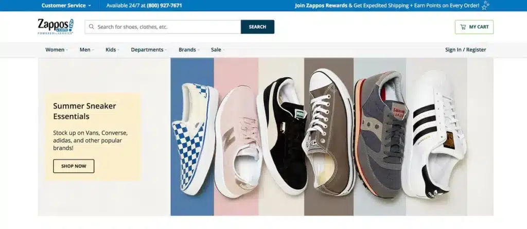 Bien que cela ne semble pas si important, mettre votre numéro de téléphone et votre adresse e-mail sur le dessus de votre site stimule généralement les conversions. Cela amène de la confiance à vos visiteurs. Les gens veulent savoir qu’ils peuvent vous joindre à tout moment. C’est une solution simple à mettre en place qui ajoute beaucoup de valeur à votre site web. Un très bon exemple est Zappos. Avec leur support client fantastique, ils ont toujours mis en évidence leur numéro de téléphone sur leur site :