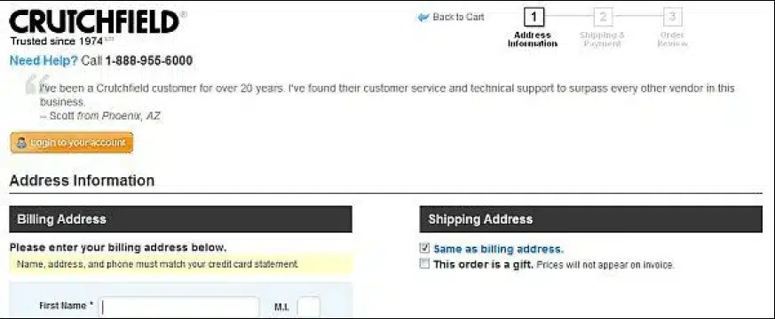 Les gens aiment être en contrôle et au courant de là où ils sont et de la où ils vont. C’est pourquoi les listes numérotées sont meilleures que les listes non ordonnées et pourquoi vous devriez avoir des indicateurs de progrès clairs sur votre site. Crutchfield l’a dans le coin supérieur droit, mais c’est assez petit et peut passer inaperçu.