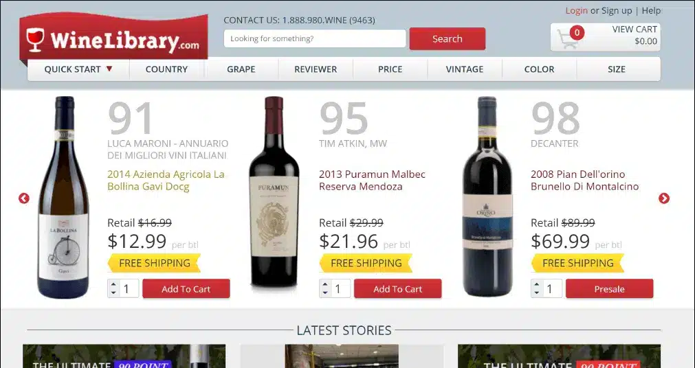 Le but de la page d’accueil est de faire sortir les gens de la page d’accueil afin qu’ils se dirigent vers les autres sections de votre site. La meilleure façon de le faire est de les faire cliquer sur une offre qui les intéresse. Regardez vos produits les plus vendus ou les meilleures offres, et insistez sur eux sur la page d’accueil. Voici comment WineLibrary fait pour qu’il soit difficile de rater ces trois bonnes affaires :