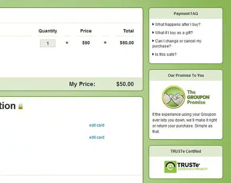 Est-ce sécurisé ? Puis-je retourner l’article ? Quand vais-je recevoir l’article commandé ? Si le visiteur n’a jamais commandé chez vous, il aura plusieurs incertitudes à gérer. Faites une liste des objections et des doutes les plus courants, et montrez-les clairement sur les pages produits et dans le panier. Voici comment Groupon traite cela (voir encadré) :