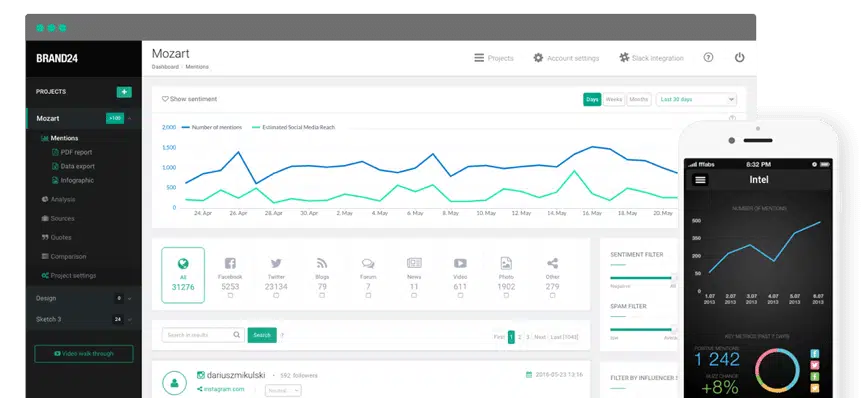 Brand24 est un outil similaire au précédent. Il vous permet de suivre en temps réel les mentions de votre marque ou de votre entreprise depuis une interface intuitive. Là encore, la plateforme peut être utilisée pour suivre les mentions de vos concurrents. Il est également possible sur Brand24 de faire des comparaisons, comme avec Mention, et d’identifier des mots-clés, thématiques ou tendances sur les réseaux sociaux.