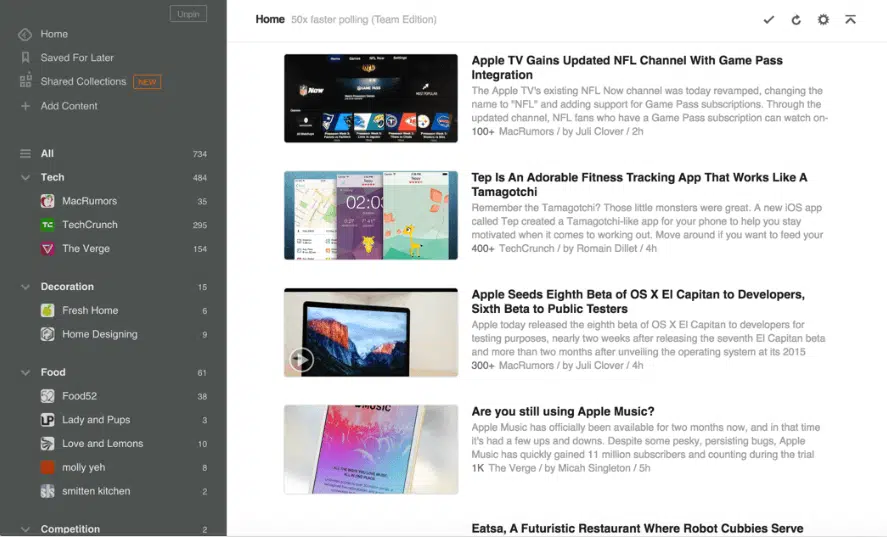 Feedly, à la base, est un agrégateur de contenus RSS et un outil de curation. Vous pouvez aussi vous en servir pour suivre et analyser les contenus de vos concurrents. Pour une veille de contenu plus avancée, des outils comme Inoreader, Curata ou BuzzSumo Monitoring sont également de plus en plus utilisés pour l’agrégation, la curation et l’analyse de contenus concurrents. Feedly peut aussi se connecter à Google Alerts, ce qui permet d’être informé directement dans Feedly à chaque fois qu’un contenu publié sur internet cite l’un de vos concurrents.