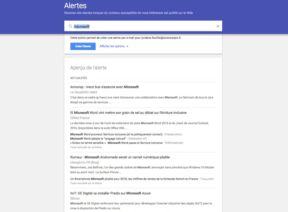 Google Alerts permet d’être informé à chaque fois que le nom de votre marque ou le nom de vos concurrents est cité dans un contenu publié sur internet. C’est l’outil le plus facile à prendre en main, le moins onéreux (c’est même gratuit) et le plus rapide pour être notifié en temps réel des mentions de vos concurrents dans les média digitaux.