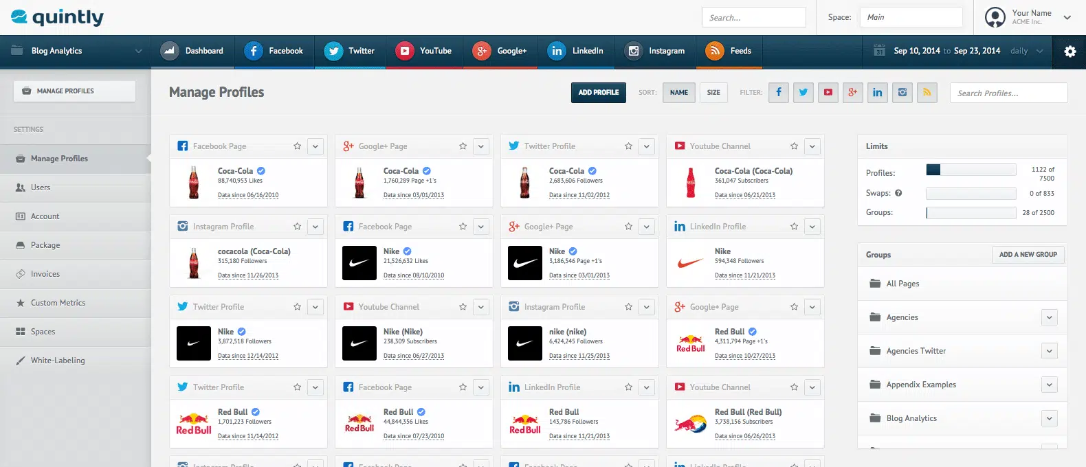 Quintly est un outil complet conçu pour vous aider à mieux analyser les données en provenance de tous vos comptes sociaux : Facebook, Twitter, Instagram, YouTube, LinkedIn, TikTok, etc. L’un des grands avantages de Quintly, c’est qu’il permet de comparer vos données social media avec celles de vos concurrents. C’est un outil quasiment incontournable pour identifier les bonnes pratiques de vos concurrents et améliorer votre stratégie sur les réseaux sociaux.