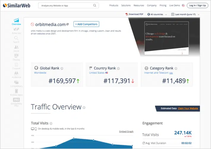 Similar Web , dans sa version gratuite, vous permet d’analyser le trafic de n’importe quel site internet, de connaître le rang du site par pays ou par catégorie et bien d ‘autres choses encore. La version Pro donne accès à un nombre impressionnant de données sur le trafic web de vos concurrents. C’est une valeur sure.