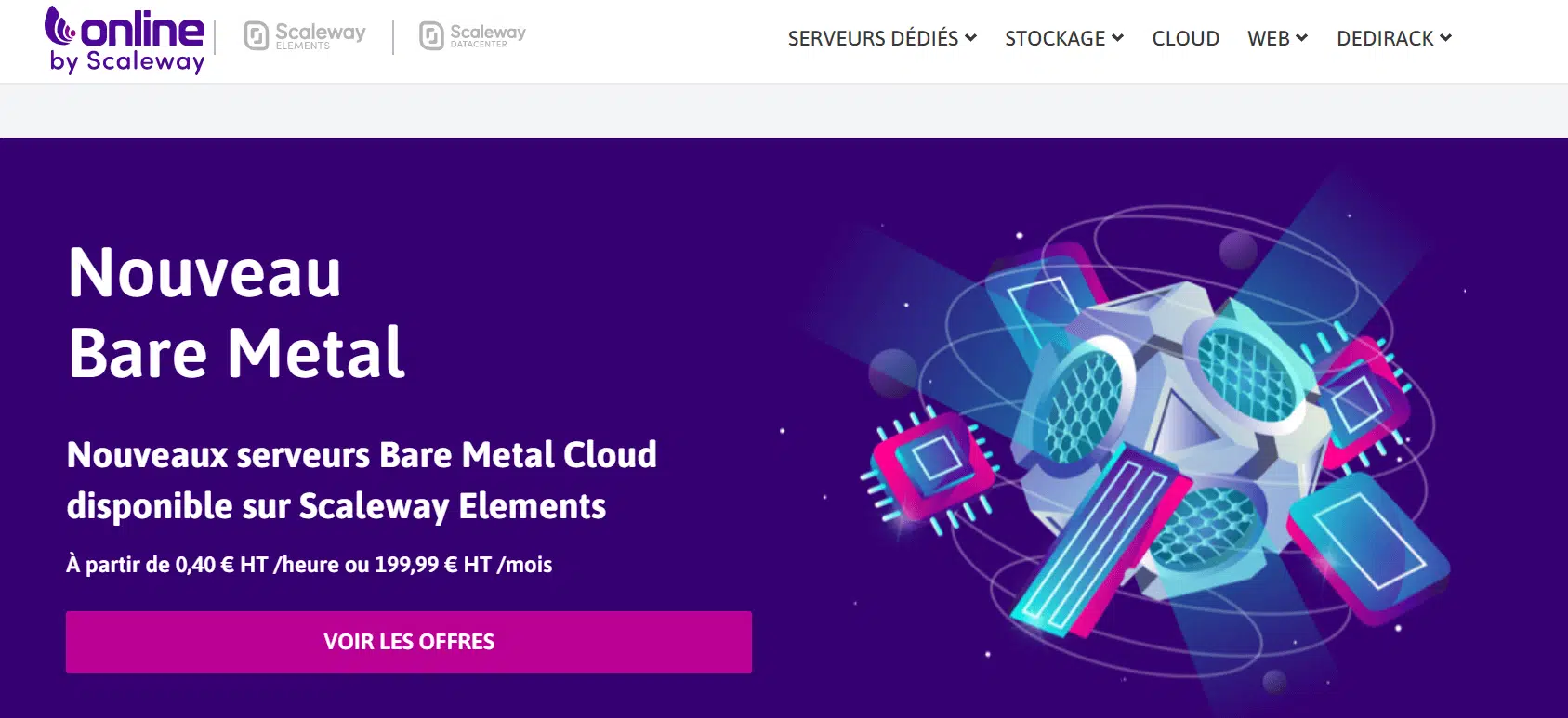 Online est l’un des acteurs majeurs de l’hébergement dédié en France. Au tarif de 11.99 euros par mois, voici ce à quoi vous pourrez avoir accès. Processeur : Intel® C2350 – 1 CPU – 2C/2T – 1,7 GHz, RAM : 4 Go DDR3 ECC, Disque dur : 1x 120 Go SSD. Si vous souhaitez monter en gamme, à 39.99 euros par mois, voici ce à quoi vous aurez le droit. Processeur : Intel® Xeon® D-1531 – 1 CPU – 6C/12T – 2,2 GHz, RAM : 32 Go DDR4 ECC, Disque dur : 2x 500 Go SSD, option : Service business avec SLA à 99,95% pour 35€ / mois.