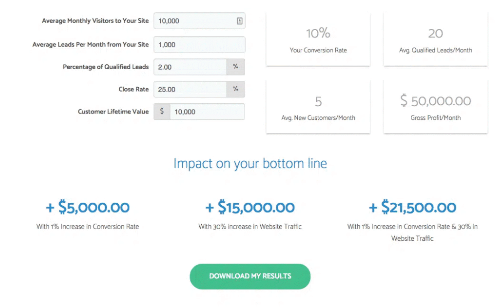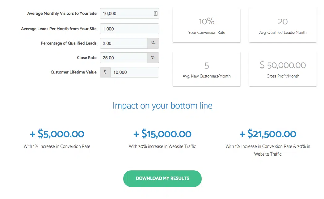 L’agence marketing Impact propose un outil calculateur de ROI. Plutôt que de simplement décrire les fonctionnalités de l’outil, Impact propose aux internautes de renseigner les valeurs des différents champs proposés pour se familiariser avec les fonctionnement de l’outil. Ils peuvent ainsi tout de suite prendre conscience des bénéfices à tirer de ce calculateur. C’est un très bon exemple d’offre attractive et bien vendue, qui vient ajouter de la valeur aux landing pages :