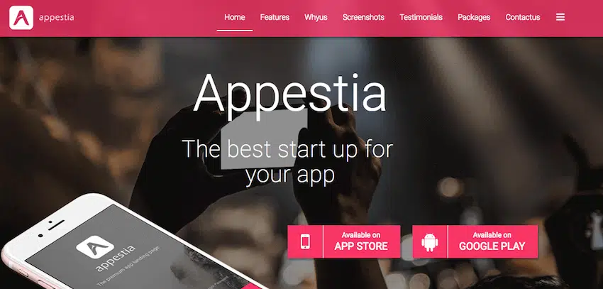 Voici un dernier exemple, avec le template de landing page Appestia (CTA bien mis en valeur, titre simple et bien lisible, couleurs homogènes) :