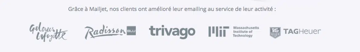 Vous ne devez pas abuser des couleurs, ne pas trop surcharger votre page de textes (surtout dans la zone au-dessus de la ligne de flottaison), harmoniser la police d’écriture, choisir des messages clairs et allant droit au but. Mettez bien en avant vos call-to-actions (CTA), et surtout votre CTA principal. En clair, le CTA principal doit ressortir par rapport aux autres CTA, et les autres CTA doivent ressortir par rapport aux autres éléments de page. Ceux de Mailjet ressortent très bien, grâce à leur centrage, leur taille importante et la couleur jaune qui se détachent bien de l’arrière plan gris-clair. Le fond jaune utilisé pour le CTA principal permet de bien le faire ressortir par rapport aux autres CTA. Juste en-dessous de l’avion, Mailjet affiche dans un bandeau quelques uns de ses gros clients pour rassurer les internautes et potentiels nouveaux clients. C’est un élément de réassurance qui joue un rôle dans la conversion non négligeable (même si c’est difficile à mesurer) :