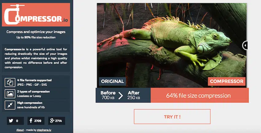 Il existe de très nombreux outils pour optimiser les dimensions et le poids des éléments de votre site. Compressor.io est l’un d’entre eux. Grâce à lui, vous pouvez déterminer les dimensions de vos images et les compresser pour en diminuer le poids :