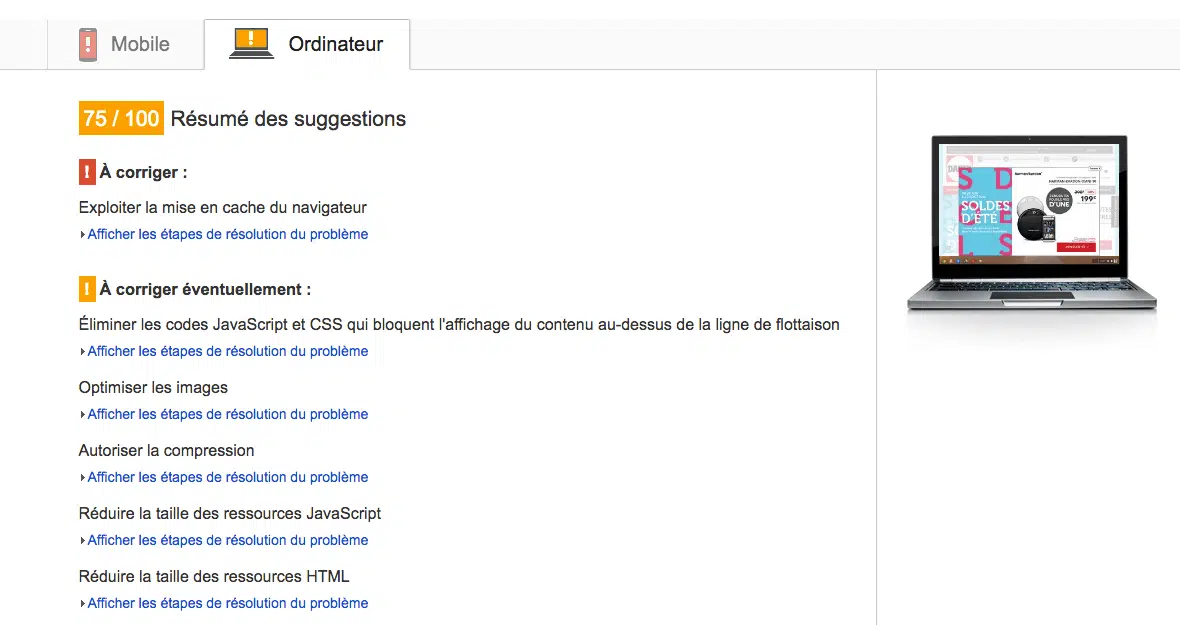 Les facteurs qui influencent le temps de chargement d’une page sont nombreux. Des images trop lourdes, l’intégration d’éléments dynamiques type slider, un codage de mauvaise qualité, des fichiers JavaScript ou CSS non compressés, l’absence de CDN, de solutions de cache avancées ou d’optimisation côté serveur, l’installation d’un trop grand nombre de plugins / extensions, une solution d’hébergement mal adaptée, etc. L’outil Google Page Speed a le mérite de vous indiquer les éléments qui peuvent être améliorés :