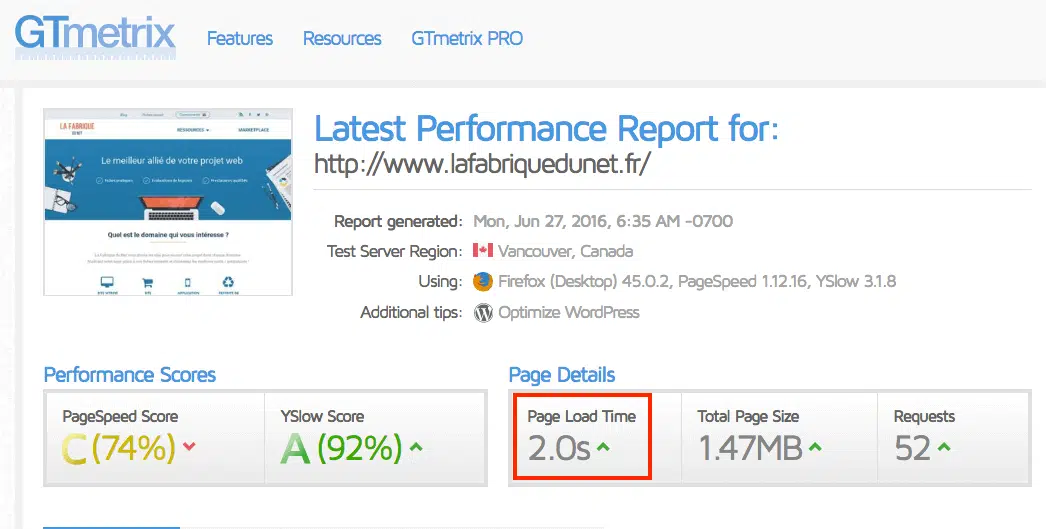Pour mesurer le temps de chargement de vos pages, plusieurs outils gratuits sont à votre disposition sur internet. Pour avoir une bonne estimation du temps de chargement et pouvoir recouper les résultats, nous vous conseillons de faire des tests sur plusieurs outils. Selon nous, trois outils tirent leur épingle du jeu : Pingdom Tools, Google PageSpeed et GT Metrix. Ce sont des outils que nous utilisons régulièrement pour analyser la performances des sites internet.