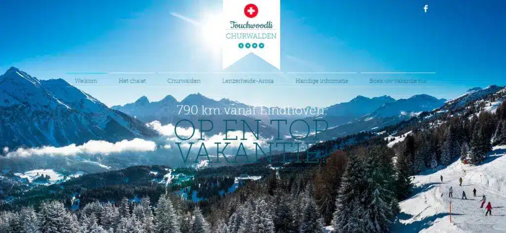 Pour commencer, partons aux Pays-Bas avec le site de « Churwalden » créé avec Wix. Comme vous pouvez le voir, une image plein écran vous accueillera sur le site. Un menu clair et épuré situé en haut, juste en-dessous du logo, vous affichera l’ensemble des pages principales du site web. Présentation des chalets avec une galerie photos, informations pratiques et page de contact, voici un très joli site vitrine pour présenter votre activité à la montagne.