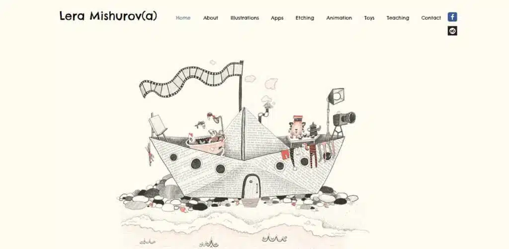 Un style totalement différent mais parfaitement adapté à la présentation de votre portfolio. Un design simple mais efficace, un menu bien visible sur le haut, accompagné de boutons pour les réseaux sociaux. Les pages « illustrations » et « animation » seront faites pour ranger l’ensemble de vos créations photos ou vidéos. Pas de footer, soyez donc certains de présenter toutes les informations nécessaires autre part sur votre site. Enfin, petit point faible, impossible de revenir sur la page d’accueil en cliquant simplement sur le titre du site.