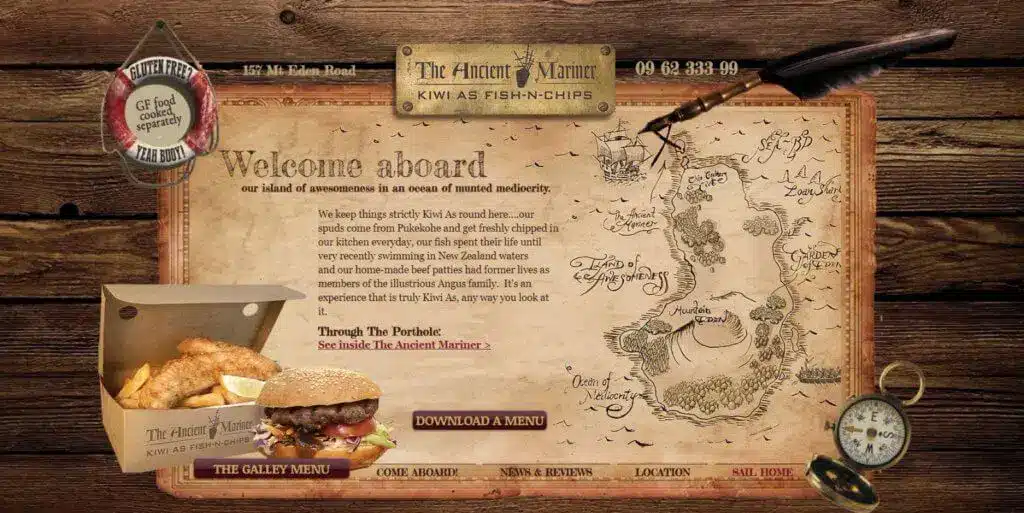 Nous aurions également pu placer ce site web néo-zélandais dans la partie e-commerce car, vous pouvez commander directement en ligne. Mais, cette action n’est possible qu’en suivant un lien qui vous redirige vers un autre site. Voilà pourquoi nous avons décidé de le laisser dans la section « site vitrine ». Encore un très joli site Wix. Dès la page d’accueil, vous serez transporté sur les flots, en essayant de déchiffrer les différentes options disponibles sur la carte. La particularité est que le menu se trouve en bas de la page et les informations de contact sur le haut.