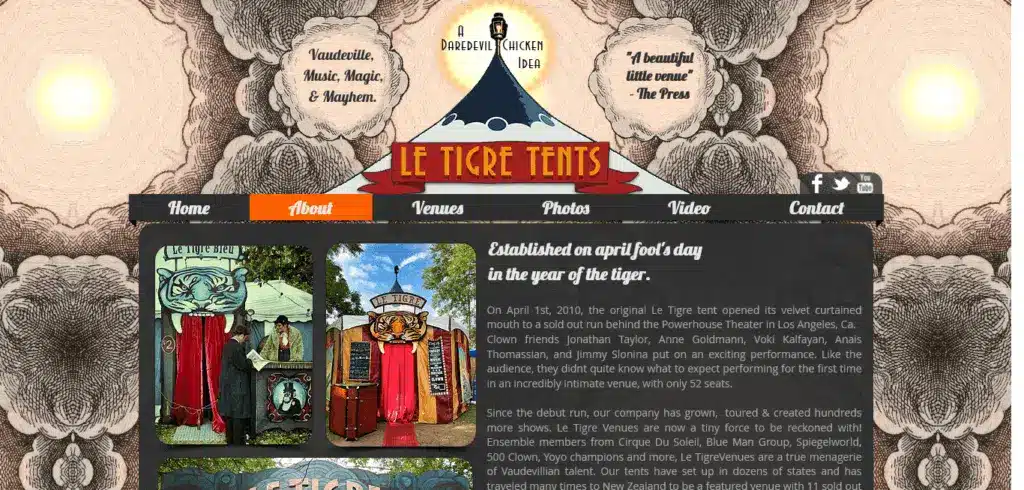 Le Tigre Tents est un spectacle de cirque et de divertissement exceptionnel rempli d’artistes talentueux. Leur site web est un exemple de la manière dont vous ne devez pas forcément vous conformer aux normes de conception et aux règles des sites web à 99,99%. Dès que vous arrivez sur leur site web, vous serez transporté dans les années 1950. Les couleurs vintages, les enseignes joliment écrites, la galerie mobile présentant leur spectacle et leurs performances – vont vous donner envie de vivre leur performance en live. Leur site comprend une simple page de destination, une barre de menus, des boutons de partage et un formulaire de contact simple.