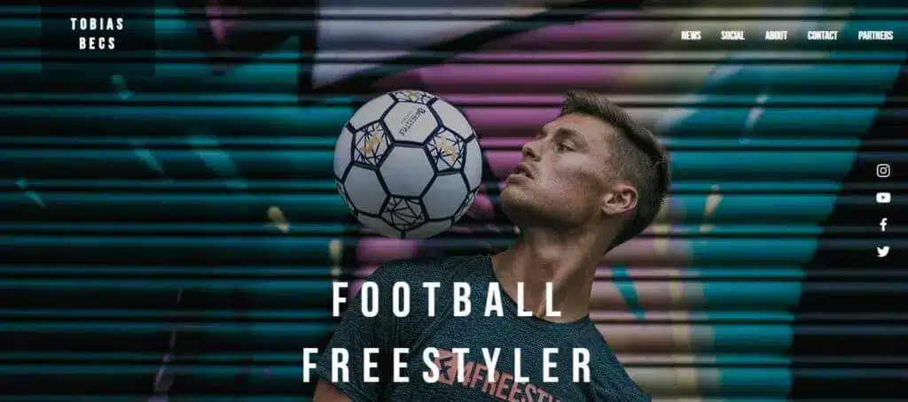 Tobias Becs est un freestyler de football. Vous pouvez directement le voir grâce à sa photo pleine page présente sur la page d’accueil. Lorsque vous descendez un peu sur la page d’accueil, vous verrez une vidéo de démonstration ainsi que des call-to-action vers les réseaux sociaux. Avec des vidéos et des photos très représentatives, présentez votre activité comme Tobias Becs afin de trouver de nouveaux clients, prospects ou partenaires.