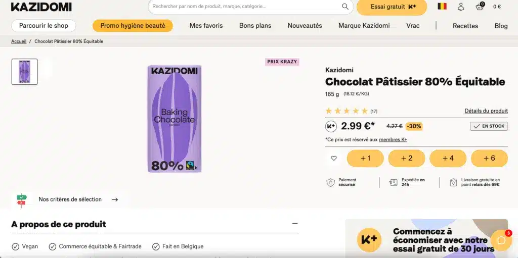Le e-shop belge de produits écologiques, bio et responsable Kazidomi est un réel exemple à suivre en termes de webdesign, surtout concernant les fiches produits. Les pages produits permettent de retrouver les avis des clients, le prix pour les abonnés Kazidomi, ainsi que le prix d’achat pour les autres internautes.