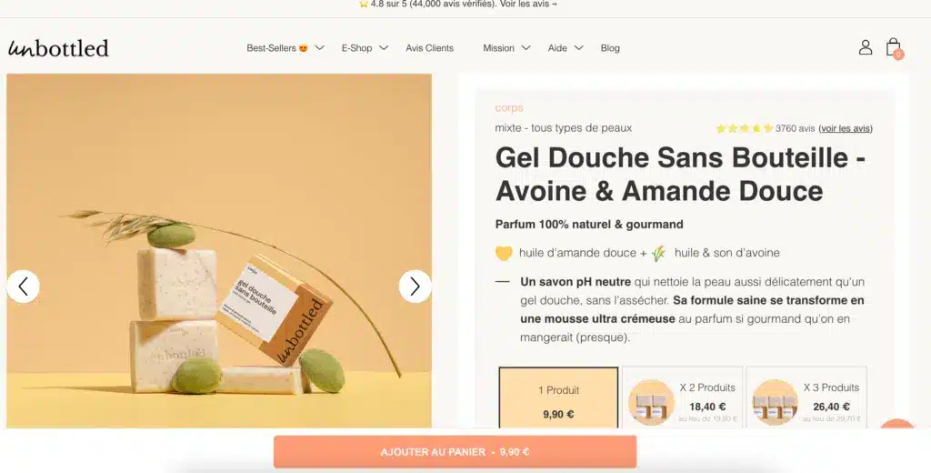 Le site d’Unbottled, marque de savons et de produits solides, est un des meilleurs exemples de site e-commerce à suivre, qu’il s’agisse de la présentation de la marque, des pages missions mais surtout des fiches produits.