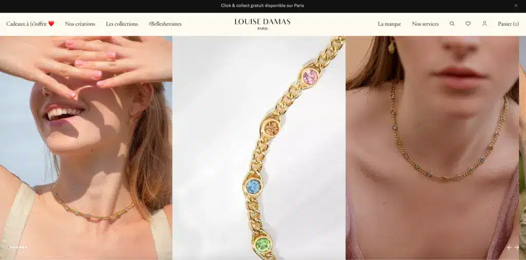 La créatrice de bijoux Louise Damas propose un site sobre, chic et très féminin. Les pages produits laissent la part belle aux visuels, en débutant avec un diaporama d’images lifestyle et de packshot produits. On apprécie particulièrement la rubrique dédiée à l’histoire de la création du produit qui permet de mettre en avant le savoir-faire unique de la marque pour se démarquer de ses concurrents.