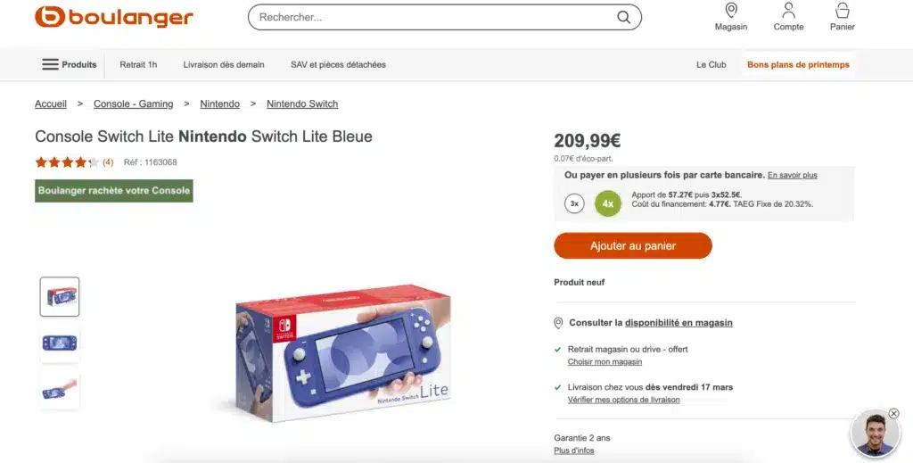 Le revendeur très connu de produits high tech, pour le bureau ou pour la maison, Boulanger, dispose d’un large catalogue de produits. Nous avons sélectionné ici la page produit dédiée à la Nintendo Switch Lite Blue. On apprécie particulièrement l’accès aux avis clients qui permet de lire l’ensemble des retours clients ainsi que l’accès à un conseiller par chatbot.