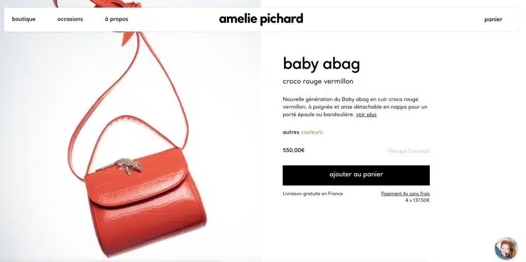 Le savoir-faire de la marque se retrouve à travers les visuels de la marque et de son sac emblématique mais aussi dans la partie « conseil » dédiée à l’entretien du sac à main. Et pour les internautes qui se poseraient encore des questions ou qui hésiteraient entre plusieurs tailles de sac à main, il est possible de joindre un conseiller de vente via le chat en ligne ou par email pour obtenir une réponse dans les plus brefs délais. On apprécie particulièrement la dualité entre la modernité des sacs à main, la tonalité de la marque, la folie créative d’Amélie Pichard et la sobriété du site internet.