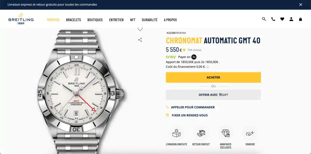 Sur l’exemple de fiche produit Chronomat Automatic GMT 40, nous avons tout particulièrement apprécié l’histoire de la montre qui permet de rappeler les dates de ce modèle mythique, les fonctionnalités clés de la montre ainsi que les différentes solutions de paiement proposées aux internautes. La marque propose également deux services essentiels aux marques de luxe : la possibilité d’appeler directement un conseiller pour passer sa commande ou encore de prendre rendez-vous en boutique pour voir et essayer la montre ou les montres qu’ils auront sélectionnées.