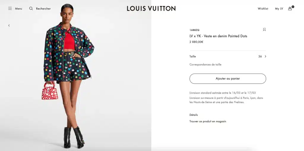 La marque de luxe française est un excellent exemple de site internet e-commerce, en termes de webdesign mais aussi concernant les fonctionnalités de ventes proposées par Louis Vuitton. Dans l’exemple choisis, on apprécie l’ensemble des visuels mis en avant, ainsi que la vidéo de présentation de la collection exclusive « Painted Dots ».