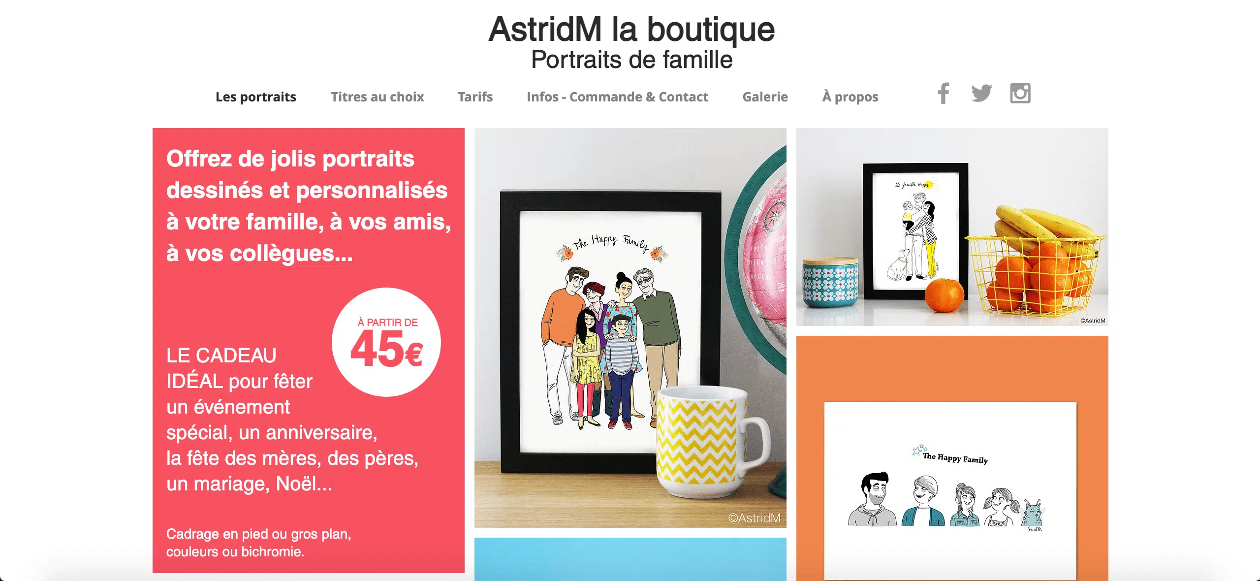 Ce site Internet met directement en valeur (sur la page d’accueil) les différentes créations proposées à la vente. Sous forme de carré ou de rectangle, une partie de la collection de portrait de famille s’affiche directement lors de votre arrivée. Vous avez la possibilité de voir les tarifs ainsi que de contacter l’administrateur pour obtenir les tableaux.