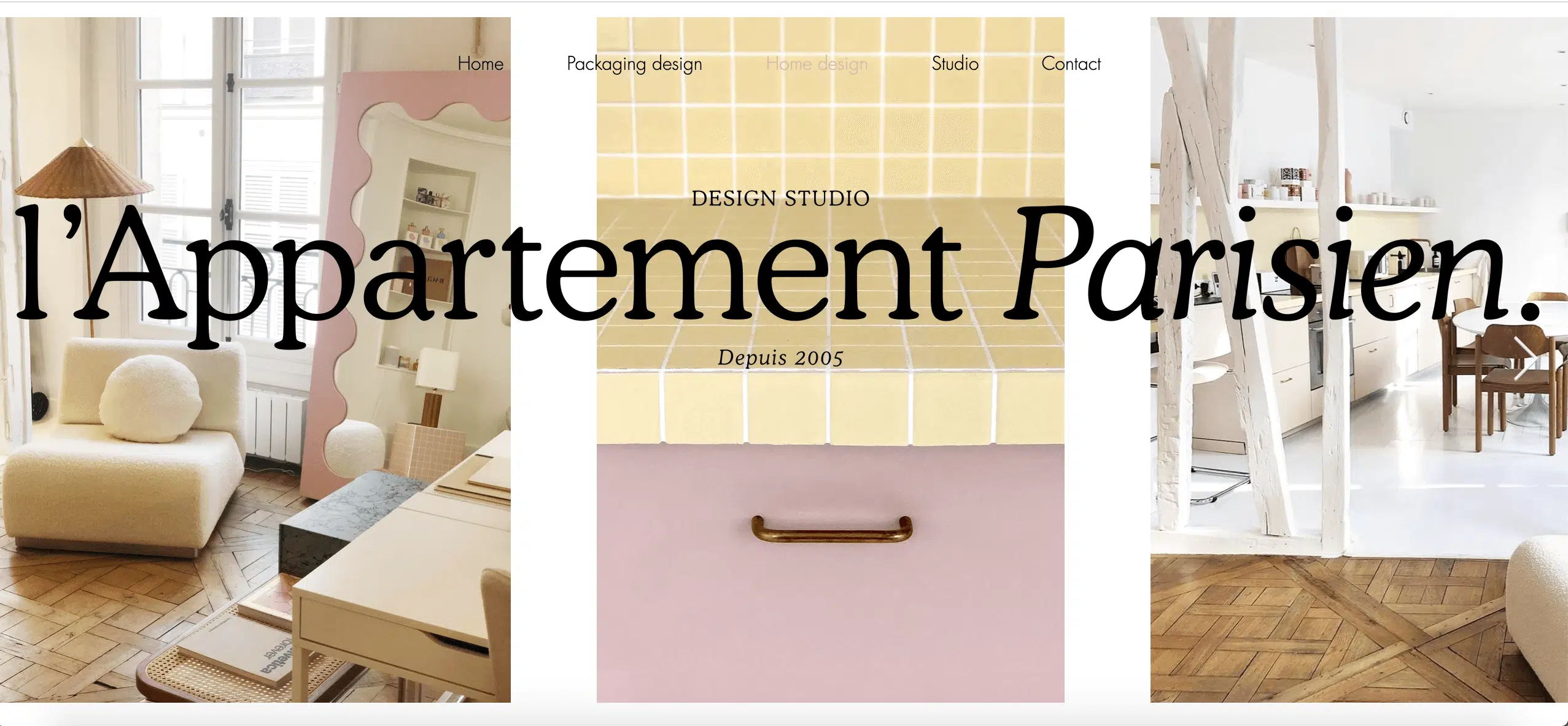 L’appartement parisien est un studio créatif, parisien donc, comme son nom l’indique. Il s’axe sur deux activités principales : le packaging design et le home design. Pour rester dans cet esprit, le site s’organise lui aussi en deux parties. À vous de sélectionner en page d’accueil le sujet qui vous intéresse : à gauche pour le packaging design, à droite pour le home design. Dans chacune des catégories, vous retrouverez les travaux correspondant disposés dans une galerie désorganisée, qui peut paraître un peu fouillie aux premiers abords. Mais, il semblerait que cet effet “peu conventionnel” soit voulu, comme le prouve ce titre accrocheur et légèrement provocateur en pleine page, qui ne vous quittera pas du début jusqu’à à la fin de votre visite sur ce site ! Un bel exemple de portfolio, original et osé, réalisé sous Wix.