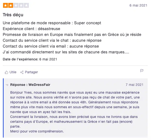 Vous allez sûrement vite repérer des insatisfactions récurrentes : livraison trop lente, information erronée sur une fiche produit, etc. Bien sûr, à l’image de WedressFair, pensez à répondre méticuleusement aux avis négatifs avec quelques règles : politesse absolue, rester factuel, expliquer le pourquoi du comment.