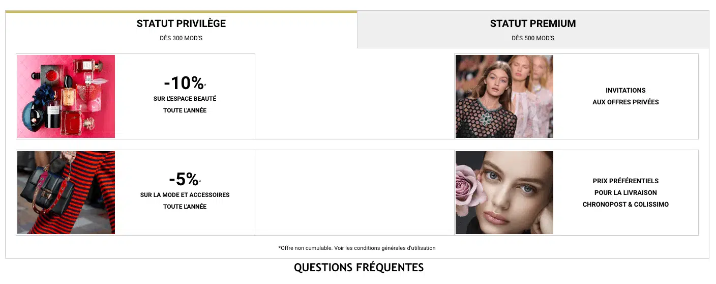 Ensuite, on remarque que Sephora liste les bénéfices de chaque programme de fidélité et ils sont nombreux, voici un extrait :