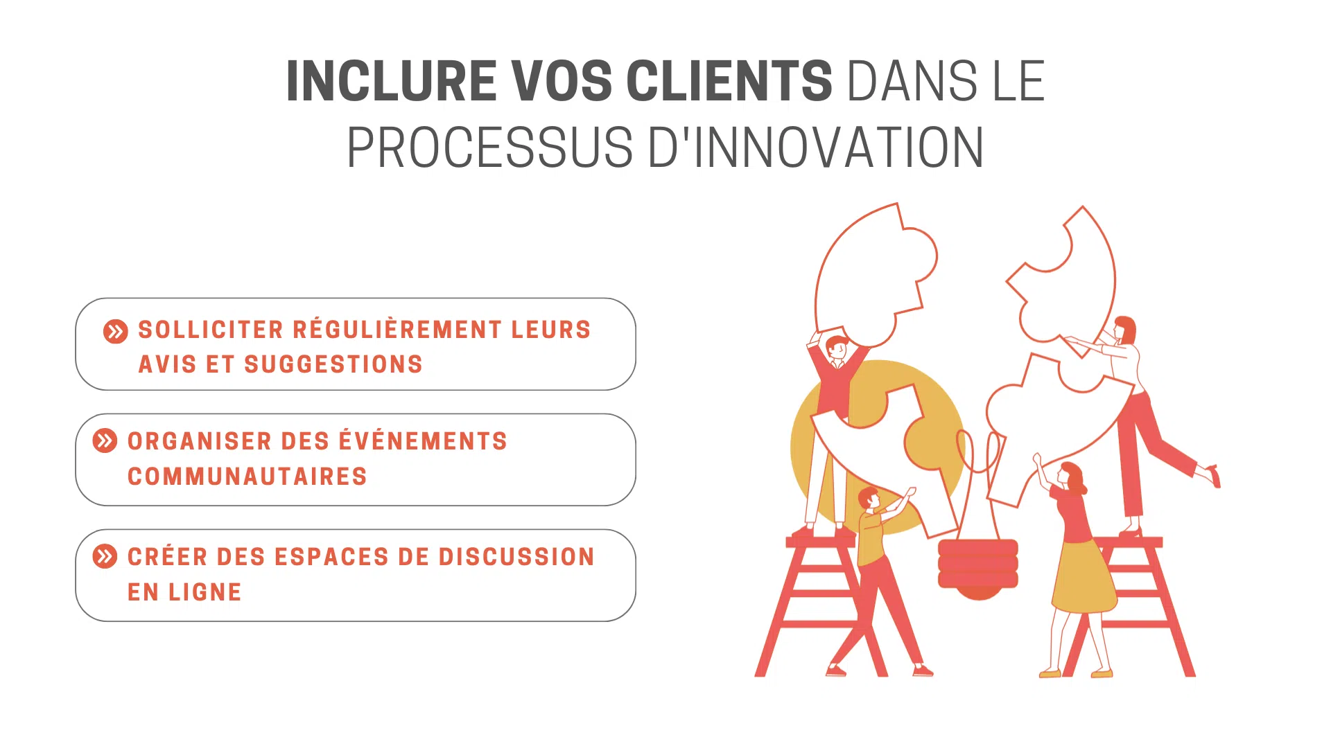 Les clients sont une source précieuse d’idées nouvelles et peuvent grandement contribuer à l’innovation au sein de l’entreprise. N’hésitez pas à les impliquer davantage dans vos processus de réflexions que ce soit à l’origine de l’idée, pour tester vos propositions ou vos maquettes par exemple. Pour inclure davantage vos clients dans vos réflexions, il est notamment possible de :