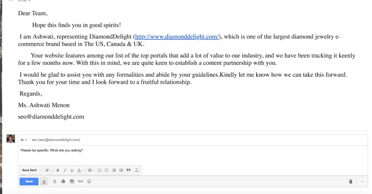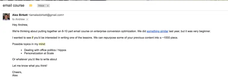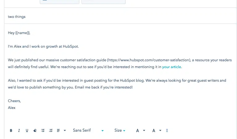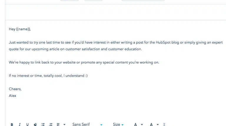 Si vous travaillez dans le SEO et que vous souhaitez faire une campagne de création de liens, ne le faites pas n’importe comment. Vous pourriez adopter un mode de création de liens agressif (comme beaucoup le font), mais une partie de vos objectifs qui consiste à établir des relations avec les influenceurs ne sera pas rempli. Ne soyez pas trop envahissant et créez un message clair et précis. Vous pouvez également invoquer la réciprocité, et pas seulement la demande d’un lien. L’email pourrait alors ressembler à celui-ci :