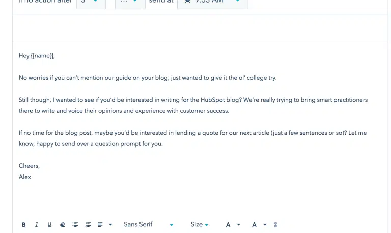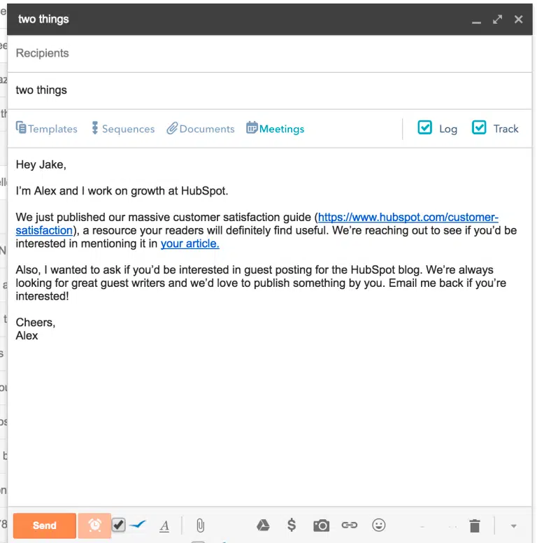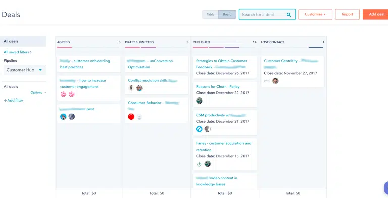 Nous avons essayé de donner autant de valeur que possible dans ces emails sans être considéré comme du spam ou ennuyeux. Nous avons également essayé de garder à l’esprit que toute cette influence ne concernait pas seulement les avantages à court terme de l’acquisition de liens, mais qu’elle permettait également d’établir des relations avec des personnes importantes et intelligentes . Pendant que nous travaillions avec un CRM moderne (comme HubSpot, Salesforce ou Pipedrive), nous suivions tout, y compris le niveau de contact. Cela créait un pipeline de transaction et permettait de configurer des workflows automatisés pour nous rappeler de recontacter certaines personnes après la 1ère prise de contact. Nous avons également suivi tous les posts d’invités que nous avons demandés, juste pour s’assurer que tout était là. Ce système vous permet d’avoir une vue d’ensemble de toutes vos communications et de vos progrès.