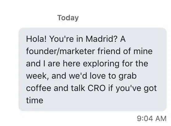 Lisez votre email avant de l’envoyer. Demandez-vous, « ai-je l’air d’une personne normale ? » Ou, « Si je reçois cet email, est-ce que je voudrais y répondre ? » Si la réponse est non, recommencez. (La plupart de ces conseils se résument à de l’empathie et que, si vous étiez le destinataire, vous n’aimeriez pas votre propre email.) Évidemment, dans certains contextes, vous devez être plus formel. En revanche, si vous demandez à prendre un café, il n’est probablement pas nécessaire de l’être :
