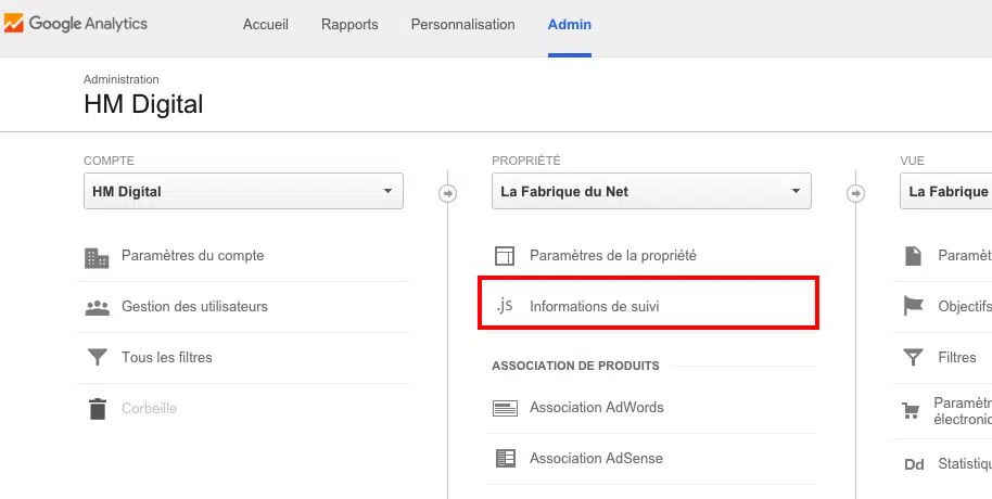 Comment configurer des événements sur Google Analytics ? L’idée générale est très simple : vous devez ajouter une ligne de tracking dans votre code de tracking Google Analytics et intégrer ensuite ce code (GA) dans le code source des pages-événements. Pour rappel, le code de tracking est ce qui permet de relier votre site à Google Analytics. Le code de tracking, une fois intégré dans le code source de votre site, permet à Google Analytics de récupérer les données de votre site. Le code de tracking est accessible depuis le menu « Admin » (==> Propriété ==> Informations de suivi ==> Code de suivi) :