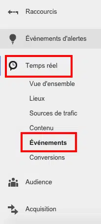 En l’occurrence, ce code d’event tracking permet de savoir combien de visiteurs accèdent par clic à la page : https://www.lafabriquedunet.fr/creation-site-vitrine/formulaire/. Pour savoir si le code de tracking a été bien installé sur la page de votre site, allez dans Temps Réel ==> Evénements depuis le menu de Google Analytics. Vous accédez de cette manière au tableau de bord qui permet de suivre en temps réel ses événements. Regardez si le tableau de bord enregistre ou non l’événement en le déclenchant de votre côté.