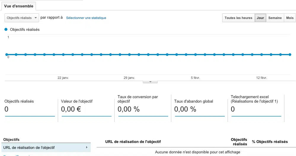 Si par exemple vous choisissez une destination (c’est-à-dire une URL), on vous demandera dans l’étape suivante de renseigner le chemin de l’URL en question. Exemple : « /thankyou.html ». On considère que l’internaute aura « converti » une fois qu’il aura atteint cette URL (après une inscription à la newsletter ou après avoir rempli un formulaire par exemple). Concernant l’option d’entonnoir de conversion, nous vous invitons à lire l’article que nous avions consacré aux 10 techniques pour améliorer le taux de conversion de son site internet. Une fois que vous avez défini et configuré votre objectif, cliquez sur « Créer un objectif ». Votre objectif est prêt. Vous pouvez maintenant suivre sa conversion à partir du tableau de bord :