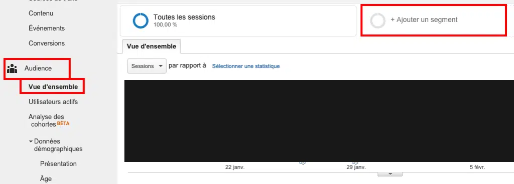 La segmentation permet d’analyser finement le trafic de son site internet. Vous pouvez combiner des segments ou créer des segments personnalisés en cliquant sur « + Ajouter un segment » depuis Audience ==> Vue d’ensemble.