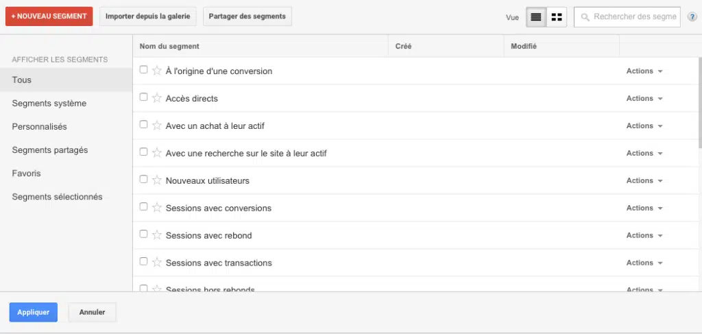 Comme vous pouvez le constater, les possibilités sont quasiment infinies. Vous pouvez segmenter à partir des données démographiques (âge, sexe, langue, centres d’intérêt de vos visiteurs, etc.), des technologies utilisées (systèmes d’exploitation, navigateurs, résolutions d’écran, etc.), des comportements (sessions, durée des sessions transactions…), des sources de trafic, etc. A vous de définir des segments personnalisés qui correspondent à votre business !