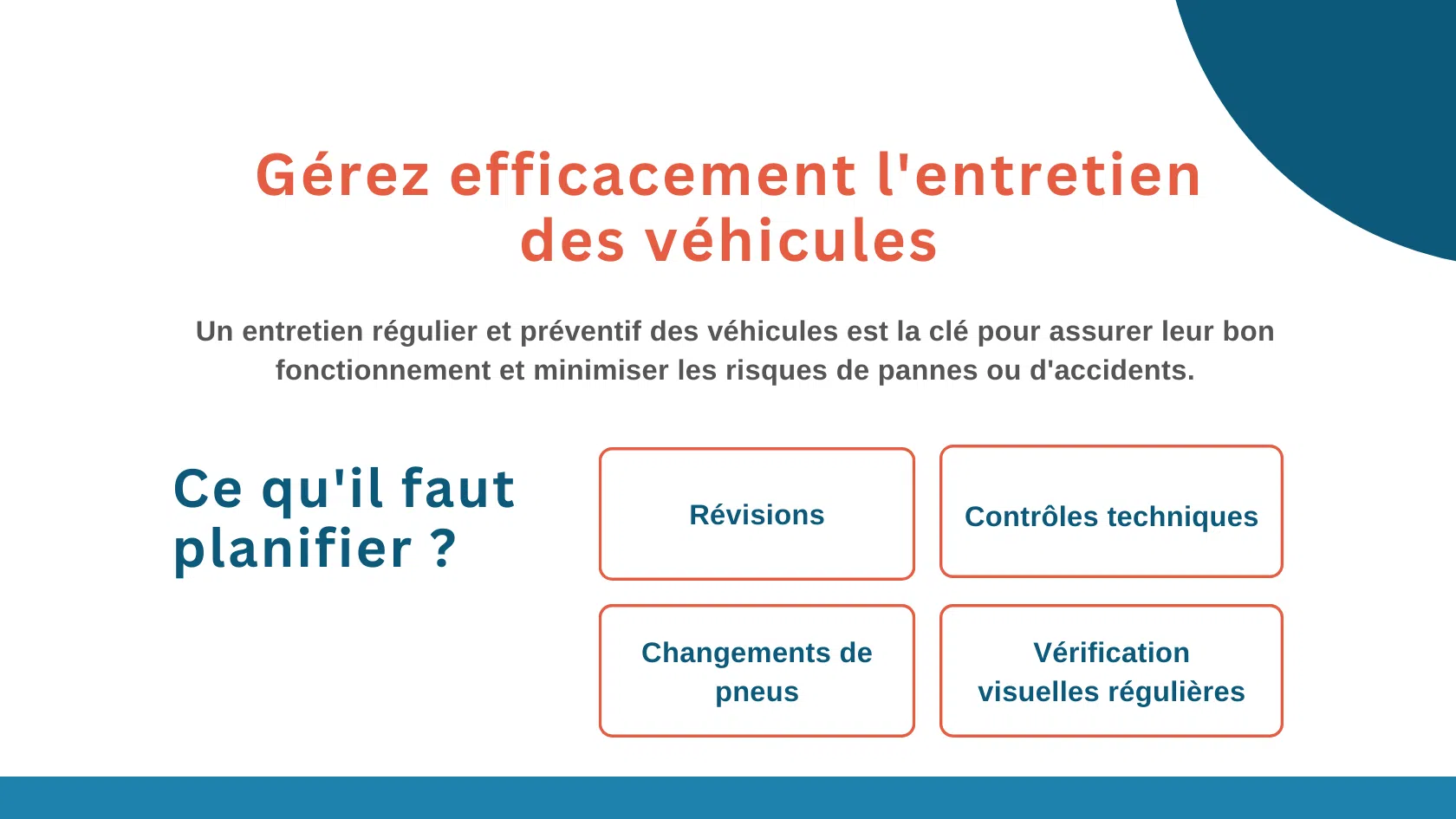 Un entretien préventif efficace vous permet de prolonger la durée de vie de vos véhicules, d’améliorer leur performance et de réduire les coûts de maintenance à long terme. En investissant dans l’entretien régulier, vous préservez la sécurité de vos conducteurs et garantissez une flotte fiable et performante.